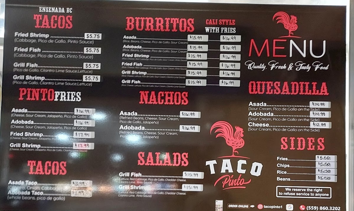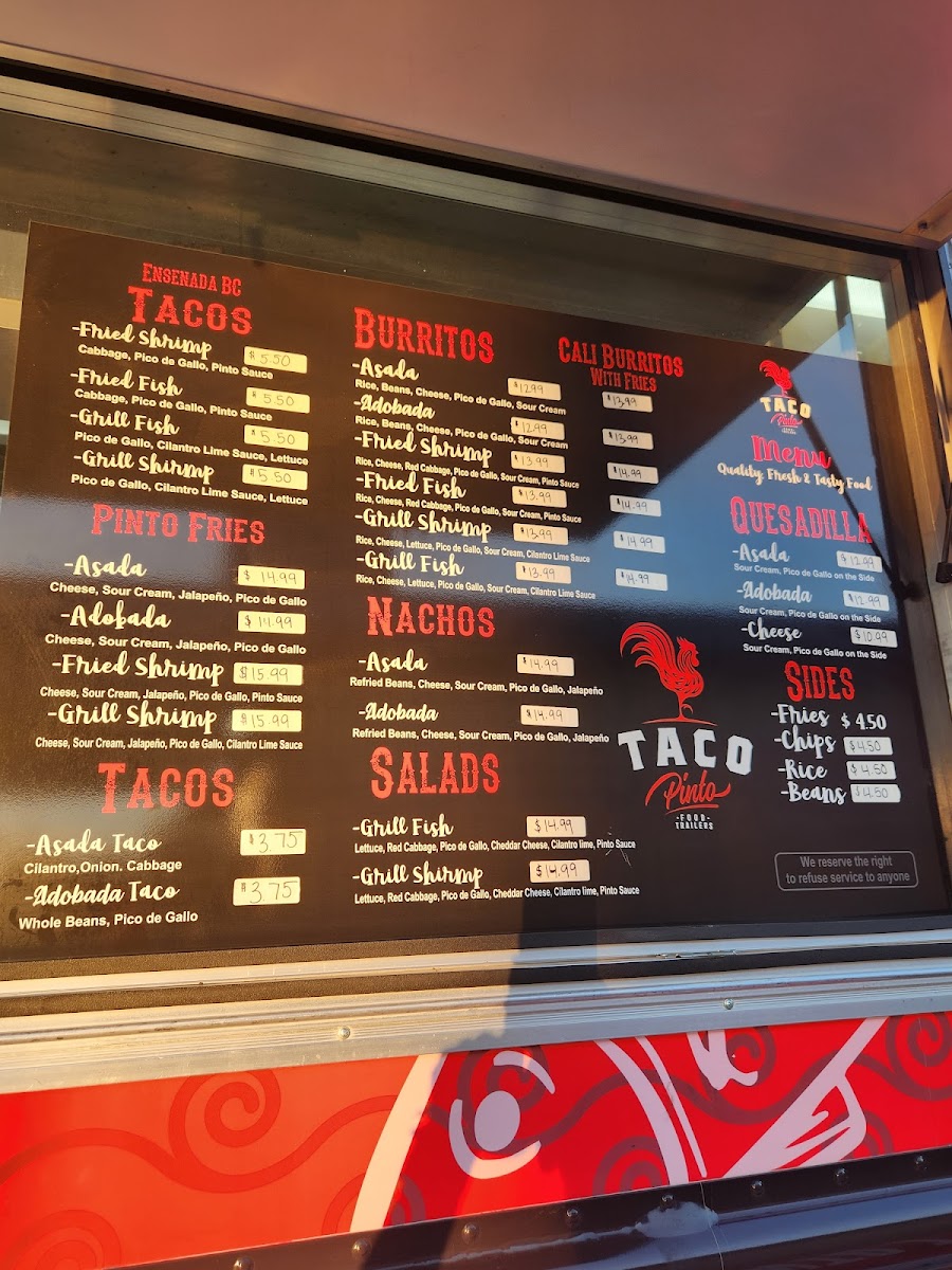 The menu at Taco Pinto Food Truck offers a straightforward, casual selection focused on satisfying tacos and hearty Mexican-inspired bites. Expect simple yet flavorful options like Tacos De Asada, crispy fried shrimp tacos, and loaded Carne Asada quesadillas, perfect for a quick lunch or a relaxed evening meal.